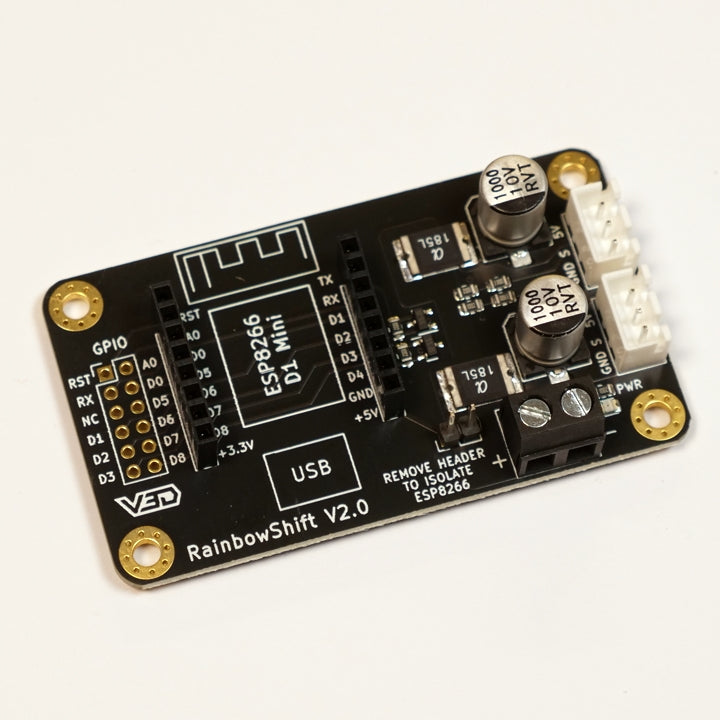 RainbowShift makes it easy to use WLED with an ESP8266 microchip. It simplifies wiring by utilizing a logic level shifter and smoothing capacitor. Designed for 3D printers running Klipper but it can also be used for other RGB control in any of your DIY and home automation projects. No soldering required with a fully assembled PCB and ESP8266 module included.