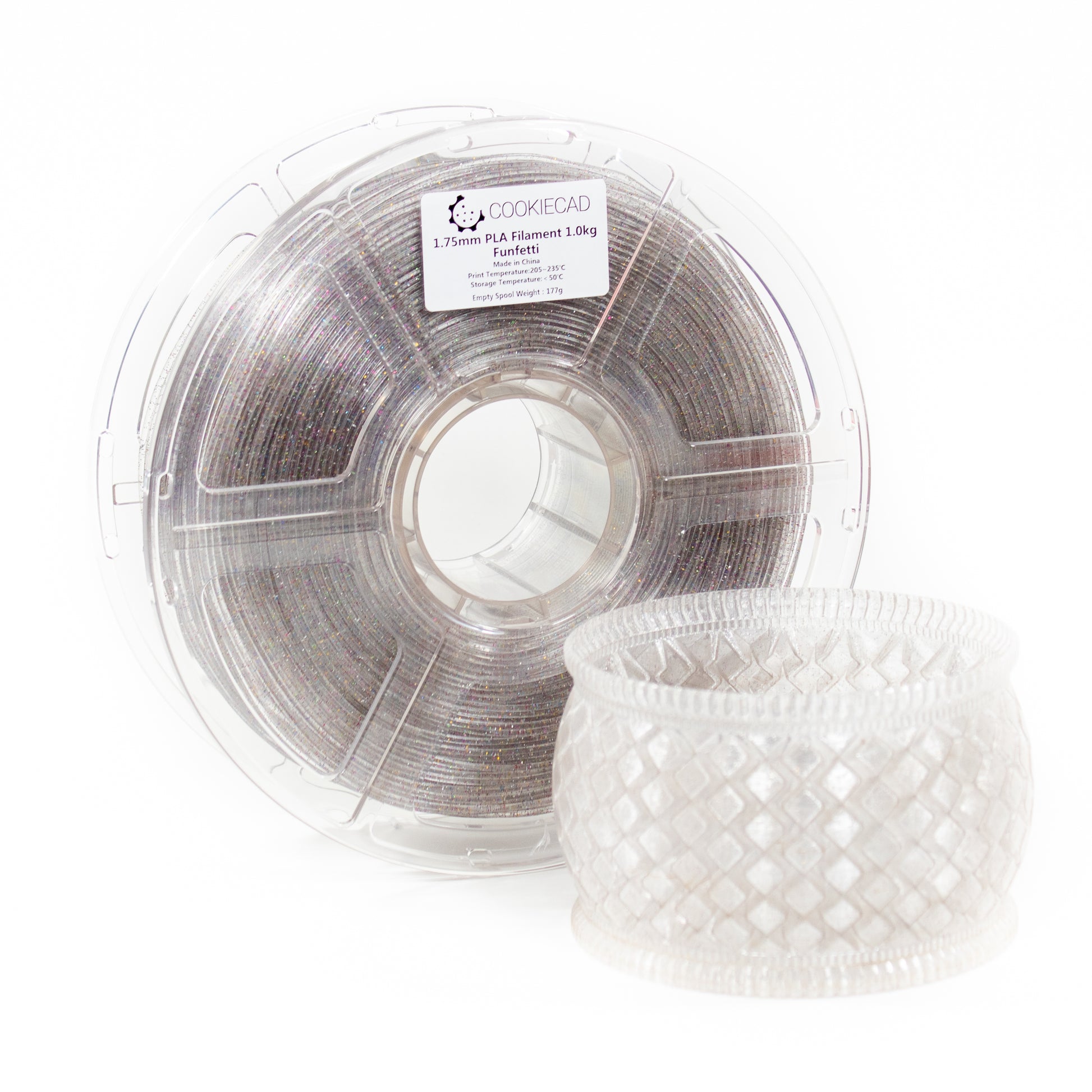 This is Funfetti Clear Cookiecad PLA. It is a clear transparent PLA filament filled with rainbow glitter.