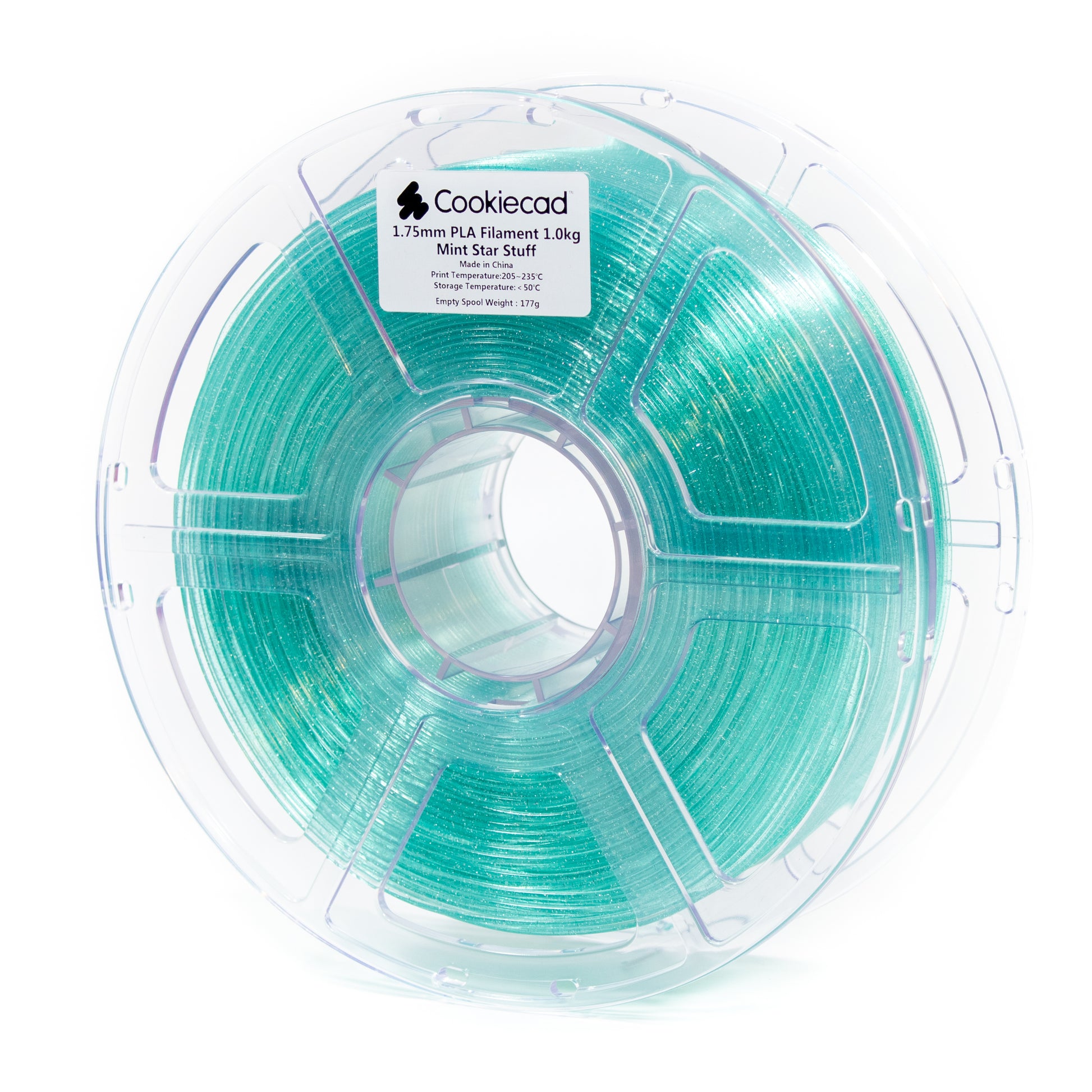 This is Mint Star Stuff Cookiecad PLA. It is a translucent PLA filament with a hint of mint green, filled with silver glitter.